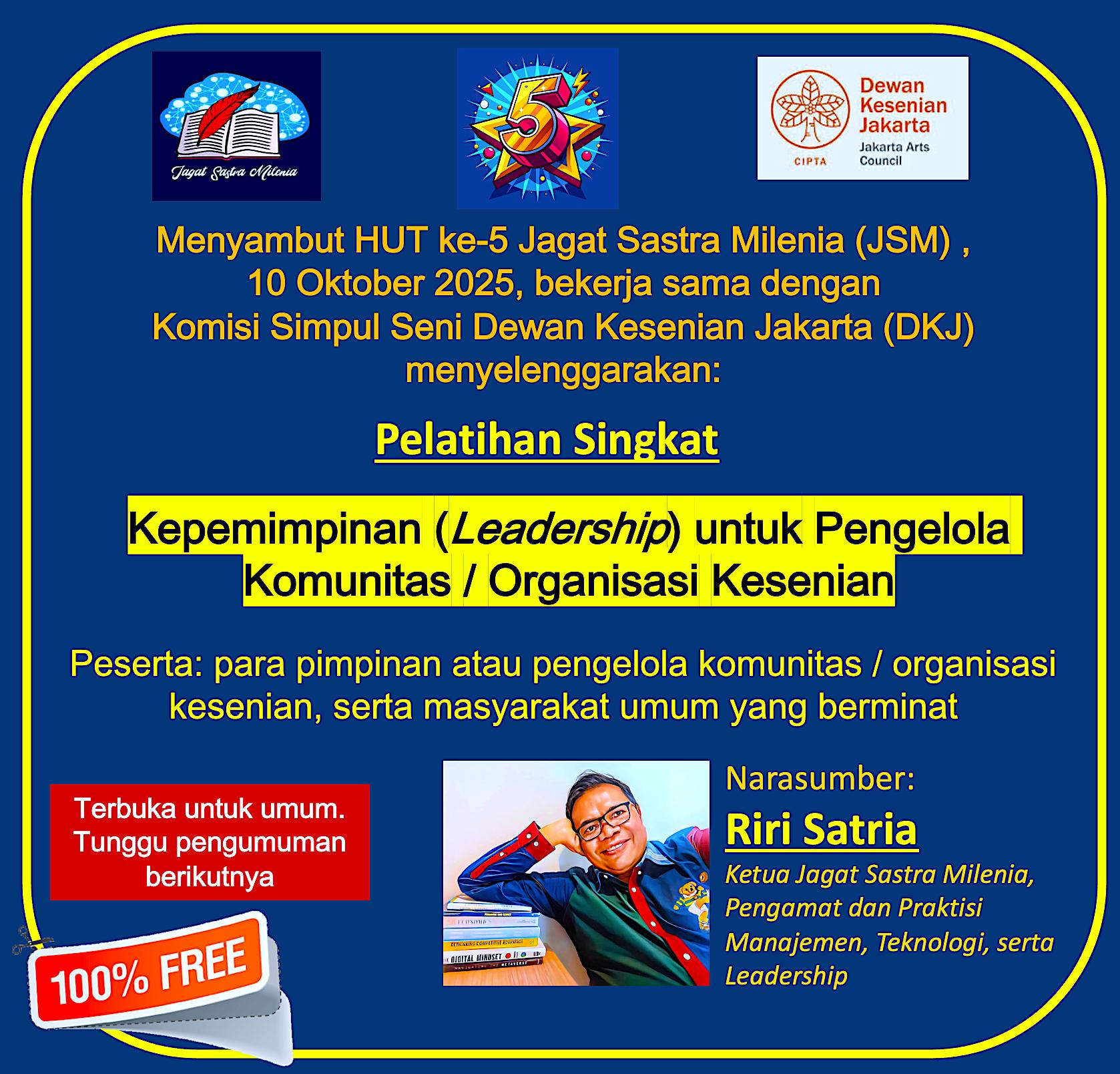 Mengawali tulisan ini, saya ingin mengucapkan alhamdulillah puji syukur kepada Allah Jalla wa Alaa atas segala karunia di setiap detik dan hela napas pada hamba-hamba-Nya. Saya mengucapkan selamat serta ikut bangga dan bahagia atas amanah baru yang diembankan negara kepada Ketua Komunitas Jagat Sastra Milenia (JSM), abang, sahabat, penyair, sang inspirator Riri Satria sebagai Komisaris Utama […]