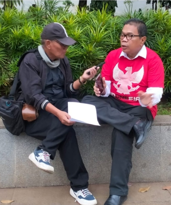Penyair dan Sastrawan -yang juga Ketua Komunitas Jagat Sastra Milenia (JSM) -Riri Satria sedang diwawancarai oleh Jurnalis Lasman Simanjuntak di area Pusat Kesenian Jakarta (PKJ) Taman Ismail Marzuki (TIM) di Jakarta belum lama ini.