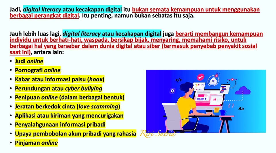 Literasi digital atau kecakapan digital bukan semata kemampuan teknis menggunakan perangkat dan aplikasi. Ia memang penting, tetapi itu baru lapisan paling luar. Di balik itu semua literasi digital justru menuntut kemampuan yang jauh lebih mendasar yaitu berpikir kritis, bersikap bijak, waspada, dan mampu memahami risiko yang mengintai di balik kemudahan dunia digital.