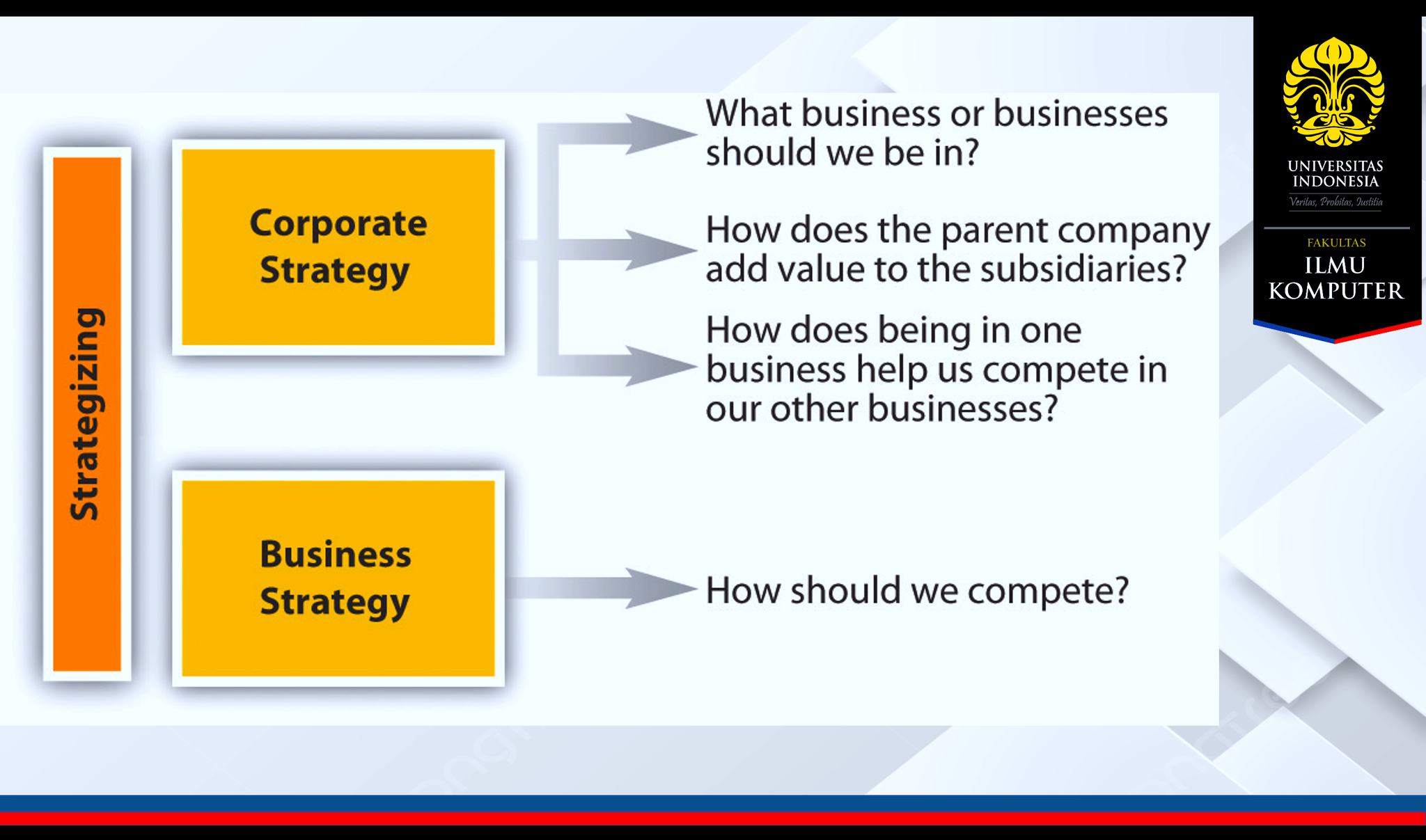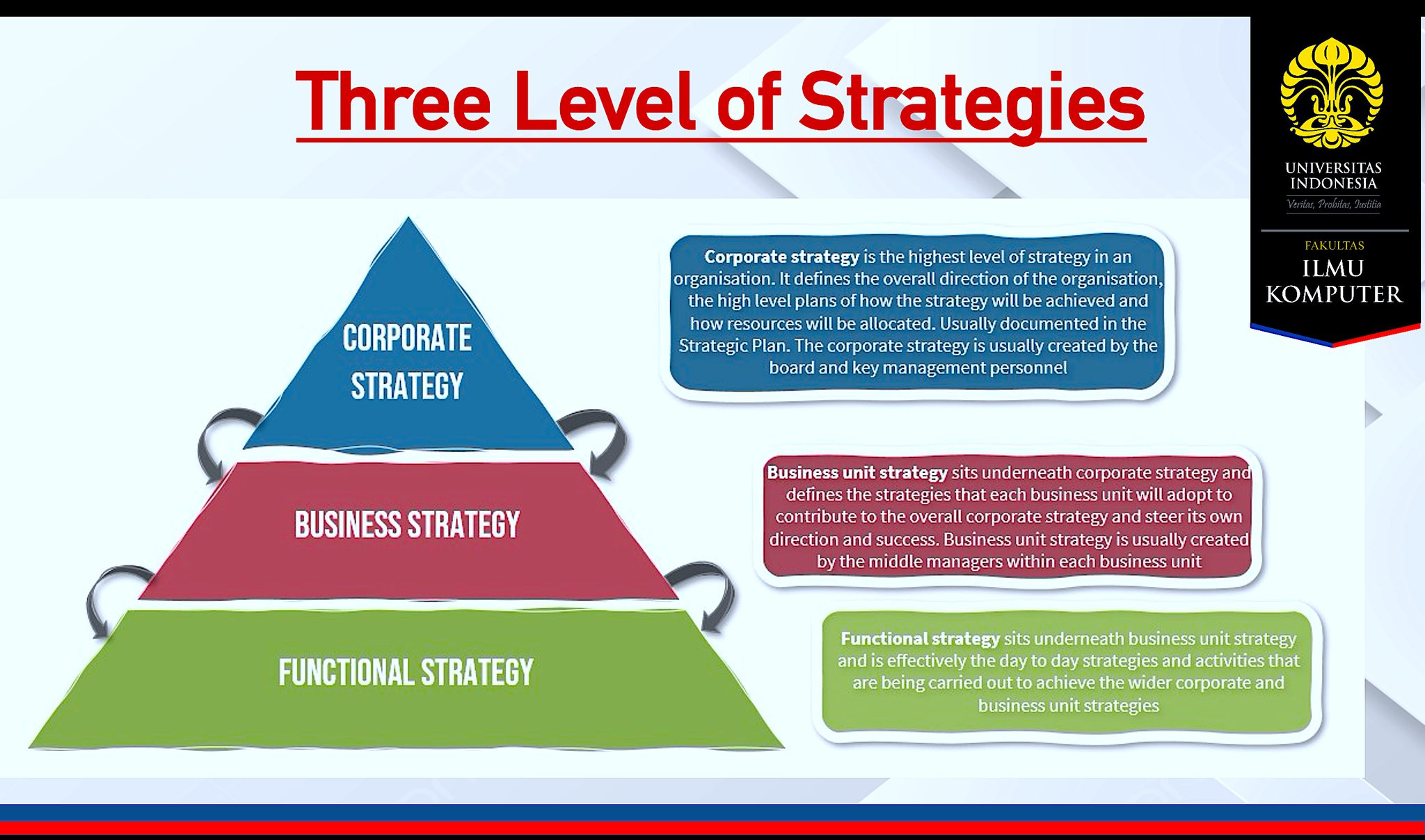 Melalui pembahasan ini, diharapkan mahasiswa tidak hanya memahami konsep corporate strategy dan business strategy, tetapi juga mampu melihat bagaimana keduanya menjadi fondasi penting bagi pengambilan keputusan strategis di dunia IS/IT.