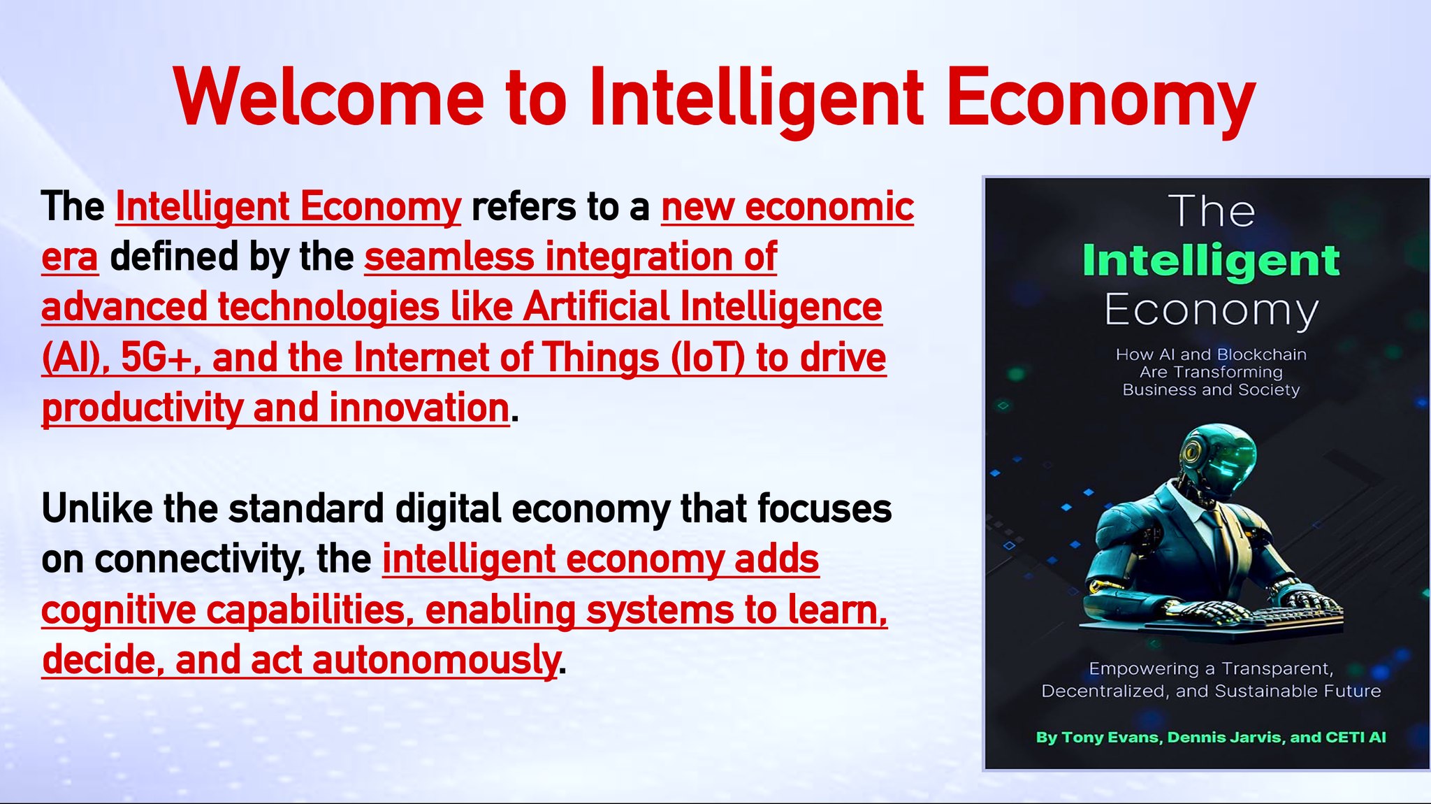 Istilah intelligent economy merujuk pada model ekonomi maju yang menghasilkan nilai dengan mengintegrasikan teknologi generasi baru seperti Artificial Intelligence (AI), Internet of Things (IoT), jaringan 5G, serta big data secara menyeluruh di berbagai sektor. Integrasi ini mendorong produktivitas, keberlanjutan, dan kesejahteraan sosial secara simultan, bukan sekadar efisiensi semata.