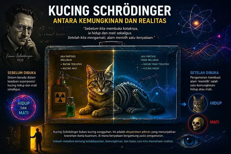 Ada sebuah kisah yang sering terdengar ganjil dalam dunia sains, sebuah kisah tentang seekor kucing yang pada saat yang sama bisa hidup dan mati. Kisah ini bukan dongeng, bukan pula cerita fiksi ilmiah dalam arti populer, melainkan sebuah eksperimen pikiran yang diperkenalkan oleh ilmuwan Erwin Schrödinger.