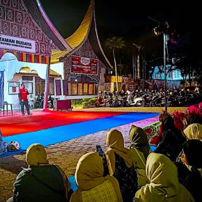 Padang – Sabtu malam (27/09/2025), pelataran parkir Taman Budaya Sumatera Barat, mendadak ramai. Sebuah panggung berdiri di pintu masuk lengkap dengan sound system. Di depannya, puluhan orang yang terdiri dari seniman dan mahasiswa dengan wajah-wajah cerah duduk lesehan pada karpet yang sengaja dibentangkan. Mereka dengan sangat antusias menanti pertunjukkan demi pertunjukan yang ditampilkan malam itu. […]